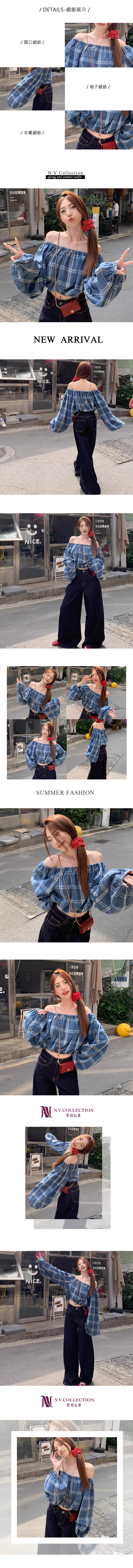 上衣 短版 格紋 鬆緊 短版 一字領 復古 夏天